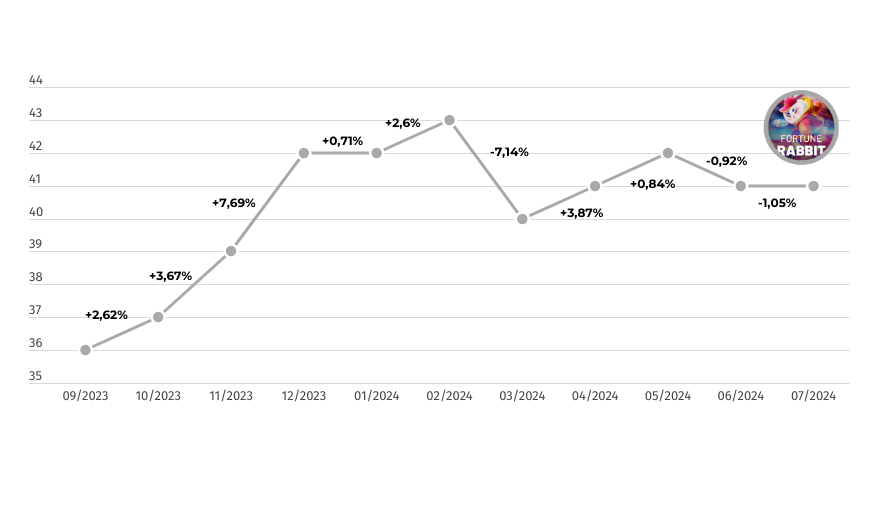 O Fortune Rabbit, segundo colocado geral entre os caça-níqueis mais populares da KTO, experimentou um crescimento notável em sua popularidade até fevereiro de 2024, quando atingiu seu maior valor (43,4).
