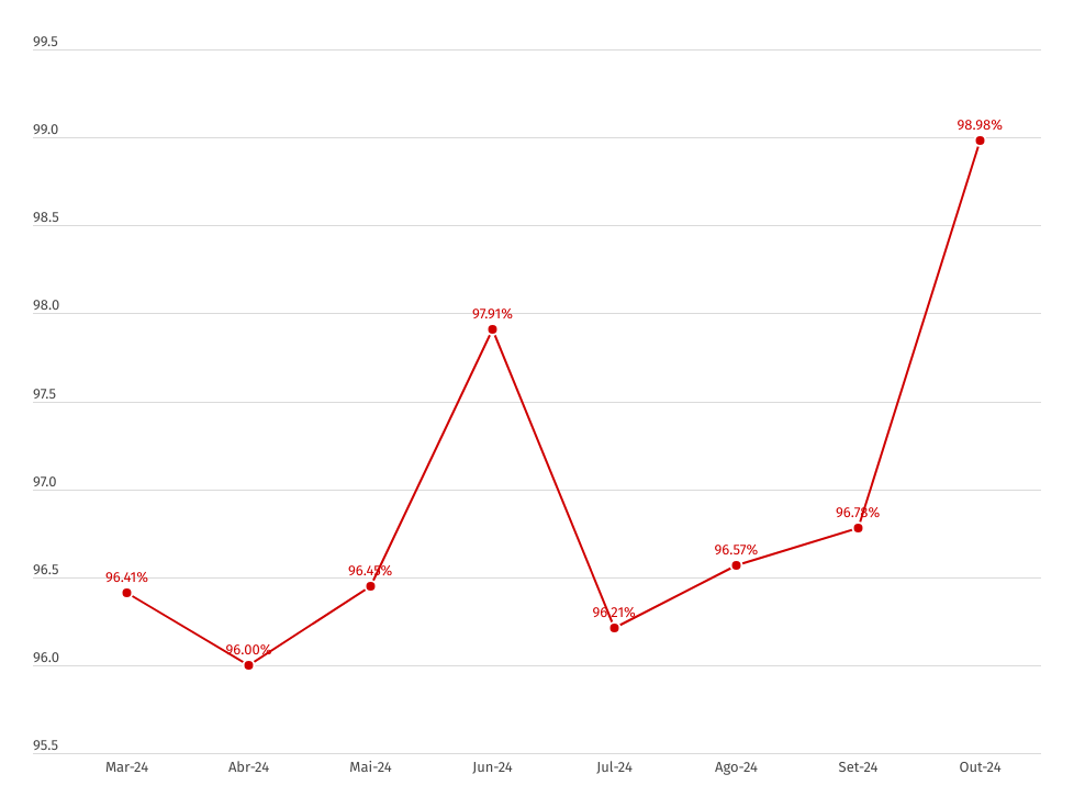 Em outubro, por exemplo, sua RTP foi de 98.98%, o que significa que, em média, a cada R$100 apostados, R$98,98 foram devolvidos aos jogadores.