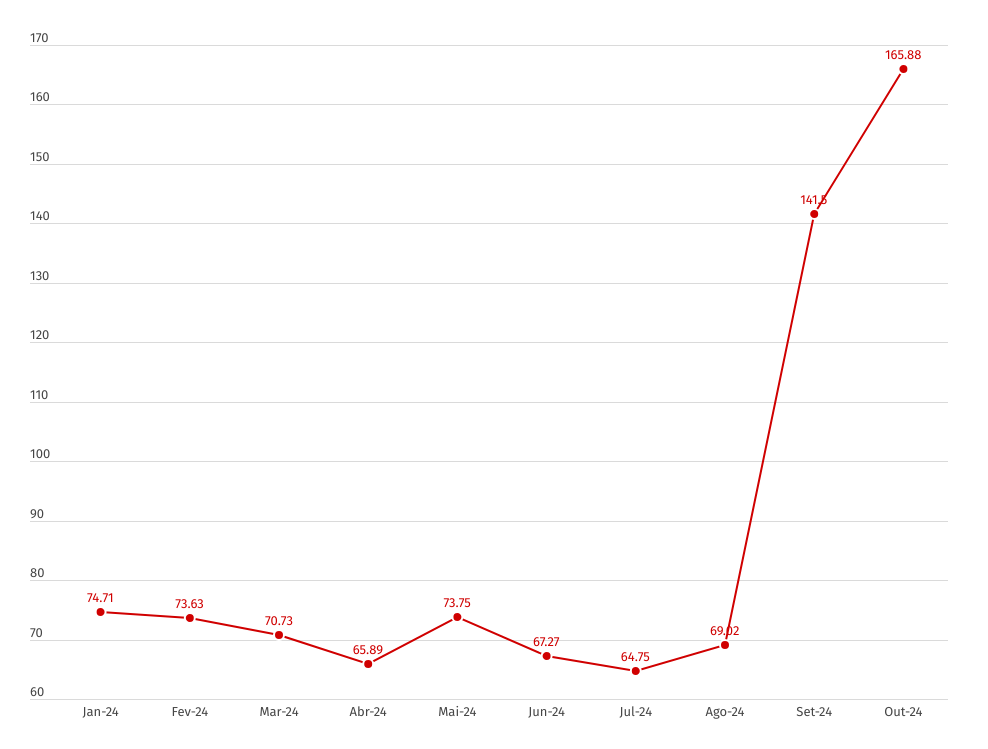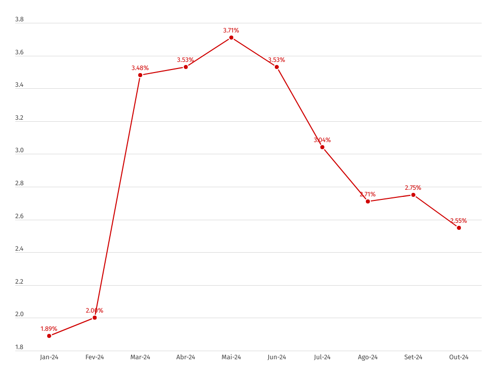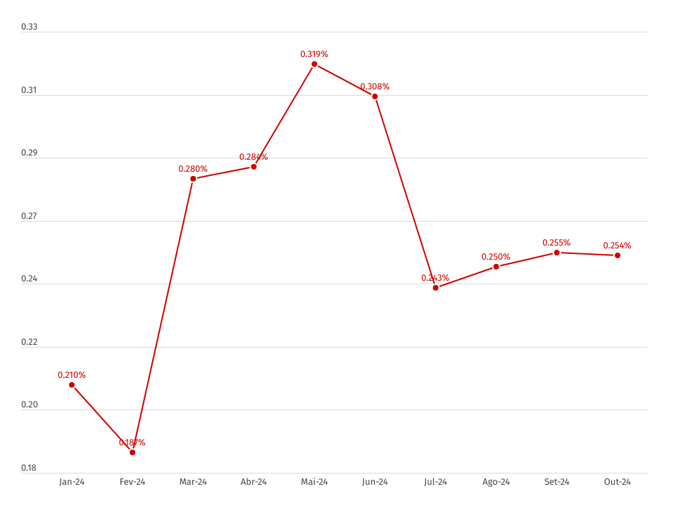 Seu pico de 0.319% também aconteceu em maio e foi seguido de uma redução até julho, quando começou a recuperar com um aumento de 5% e uma subsequente queda em outubro.