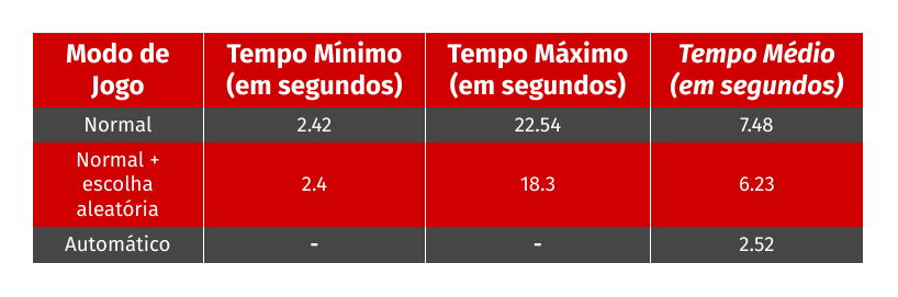 Conforme observado na tabela acima, o modo normal com escolha aleatória é 1.25 segundos mais rápido que o modo normal, onde o próprio jogador decide onde clicar.