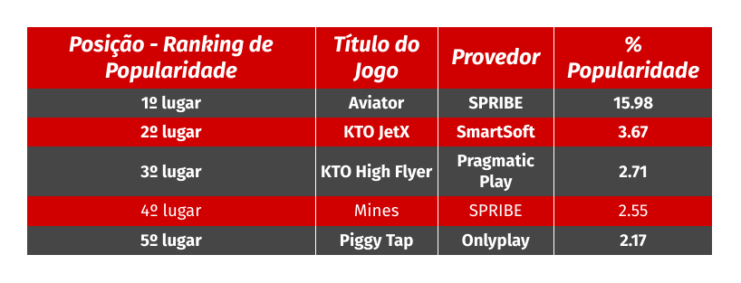 No entanto, o Top 5 é quase todo ocupado por Slots. Quando entramos na categoria dos Crash Games, o Mines fica em 4º lugar. Atrás somente do Aviator, KTO JetX e KTO High Flyer.