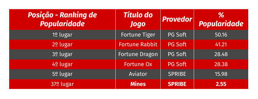 Em termos de popularidade, o Mines ocupa a 37ª posição entre os jogos mais populares de outubro de 2024.