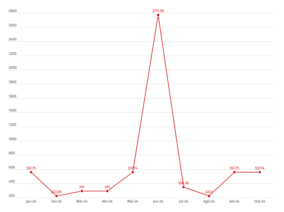 Como podemos observar, há um pico em junho de 2024, com um incrível aumento de 396.93% em relação ao mês anterior. Neste mês, o multiplicador vencedor ultrapassou o valor de 2700.