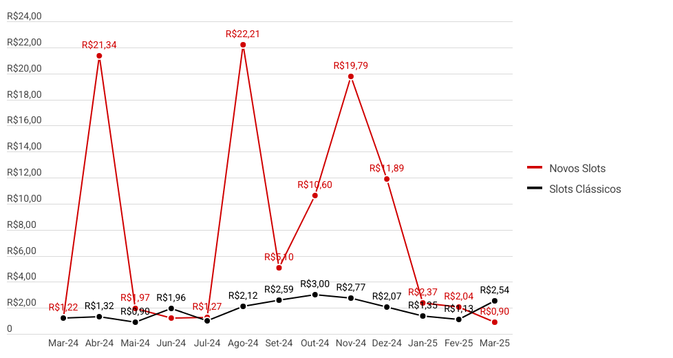 Já os novos slots apresentaram picos acentuados em determinados meses, como em abril (R$21,34) e agosto de 2024 (R$22,21). Além disso, vale notar que, embora haja meses em que os valores dos novos slots se aproximam dos clássicos, a tendência geral mostra uma volatilidade muito maior nas apostas em novos slots.