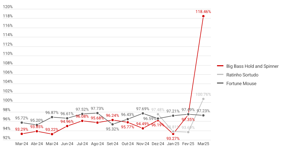 Para compreender melhor essas variações entre diferentes títulos, analisamos o primeiro colocado de cada série com maior RTP em março de 2025: Big Bass Hold and Spinner, Ratinho Sortudo e Fortune Mouse.