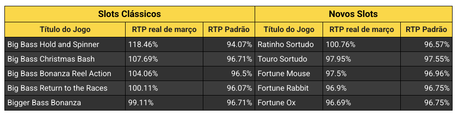 - RTP em Destaque – Os clássicos tiveram a maior RTP real, com o Big Bass Hold and Spinner alcançando 118.46% em março, 25.92% a mais que sua RTP padrão.