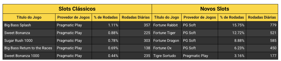 - Aposta Mais Frequente – Os clássicos mantiveram um tamanho médio de apostas menores (R$1,90), enquanto os novos slots atingiram picos acima de R$21,00.