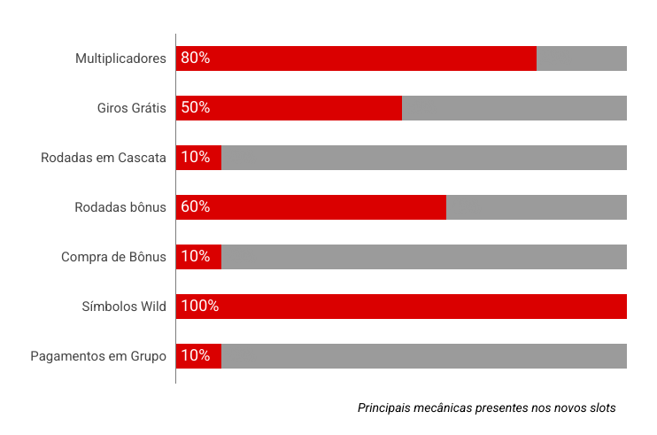 Nos novos slots, a história é outra: os símbolos Wild aparecem em 100% dos jogos, seguidos pelos multiplicadores (80%) e pelas rodadas bônus (60%).