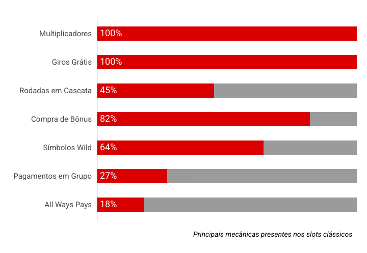 Por outro lado, elementos como multiplicadores e giros grátis são mecânicas frequentes entre os clássicos, presentes em todos os títulos analisados.