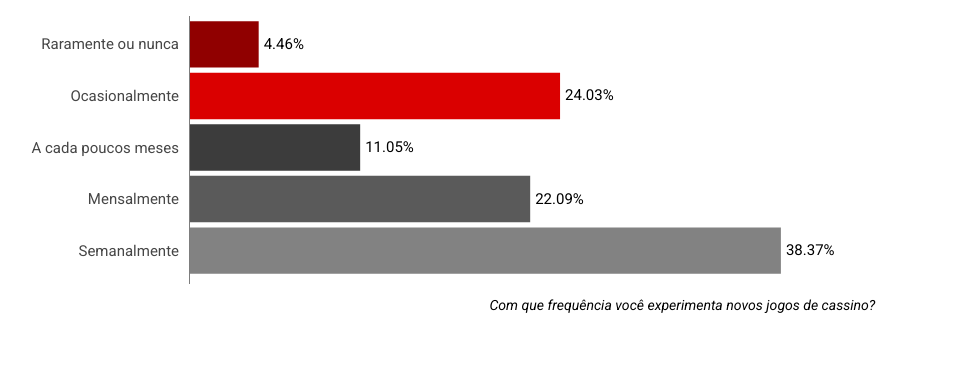 Para entender o que realmente impulsiona a popularidade dos slots online, ouvimos diretamente nossos jogadores e descobrimos que a maioria prefere experimentar novos jogos de cassino semanalmente (38.37%), enquanto apenas uma pequena parcela (4.46%) raramente ou nunca se aventura em novidades.