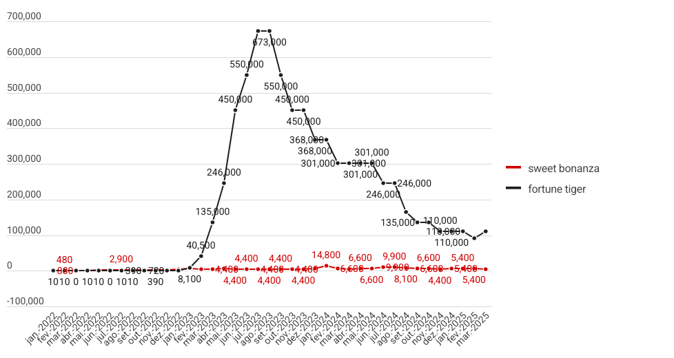 Ao compararmos o interesse por termos como “fortune tiger” e “sweet bonanza”, percebemos que, enquanto o Sweet Bonanza teve uma trajetória linear de interesse ao longo dos anos, o Fortune Tiger teve uma ascensão meteórica ao longo de 2023 e, desde então, sofre quedas paulatinas.
