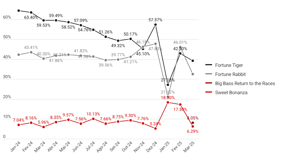 A análise histórica dos dados reforça essa diferença. Durante todo o ano de 2024, títulos como Fortune Tiger e Fortune Rabbit mantiveram índices de atividade consistentemente acima de 39%, enquanto clássicos como Big Bass Return to the Races e Sweet Bonanza oscilaram entre 5% e 10%. Mesmo em janeiro, quando a popularidade dos clássicos subiu, ao passo que os novos jogos tiveram uma queda notória, a distância entre eles permaneceu expressiva.