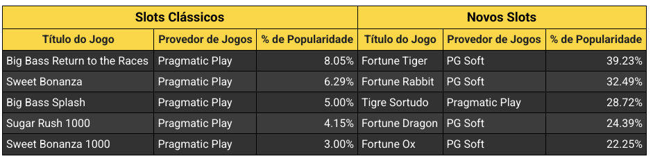 - Líder em Popularidade – Fortune Tiger domina mais uma vez com 39.23% dos ativos, representando os novos slots que sobressaem quando o assunto é popularidade.