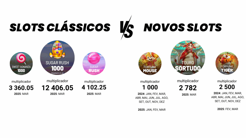 Os dados de março de 2025 revelam que, em média de rodadas jogadas, os novos slots dominam, acumulando quase cinco vezes mais rodadas jogadas que os clássicos.