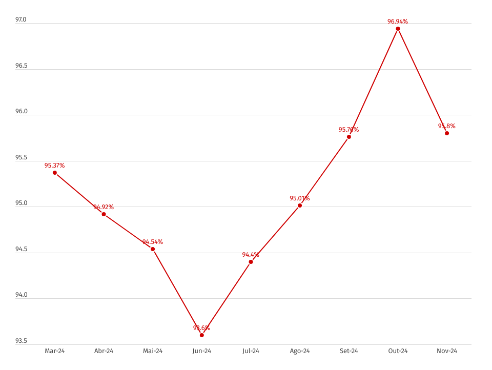 - Variação na RTP: A RTP mais alta foi registrada em outubro de 2024, atingindo 96.94%, enquanto a mais baixa foi em junho do mesmo ano, com 93.6%, 2.9 pontos percentuais a menos que a RTP oficial.