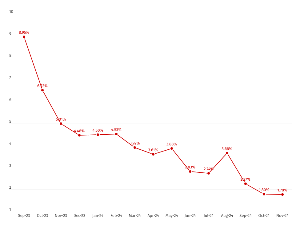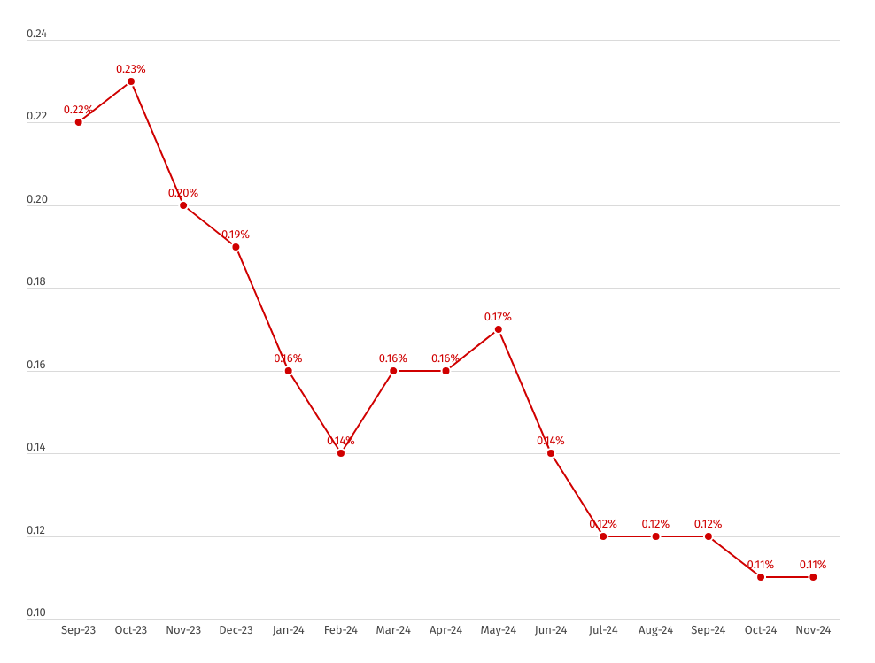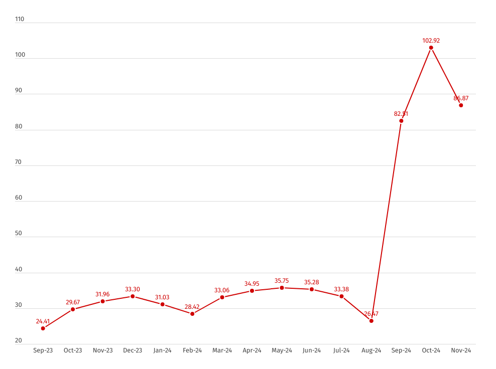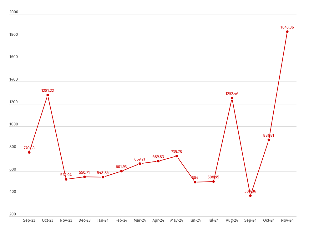 É possível notar que houve um aumento gradativo de novembro de 2023 a maio de 2024, seguido de uma oscilação na segunda metade do ano, com um salto que culminou no maior valor registrado nesta série histórica: 1843.36 neste mês de novembro. Em comparação com setembro, quando tivemos o menor valor registrado (383.86), houve um aumento de 380.22%.