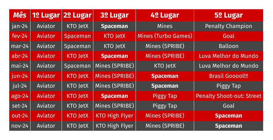 A tabela abaixo resume o desempenho dos top 5 crash games ao longo dos últimos meses: