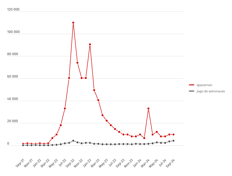 De acordo com uma análise realizada com dados do Mangools, as buscas por “spaceman” e “jogo do astronauta” começaram a crescer em meados de 2022, até atingirem seu pico em setembro do mesmo ano. Em seguida, houve uma tendência à queda, com picos esporádicos como o de março de 2024.